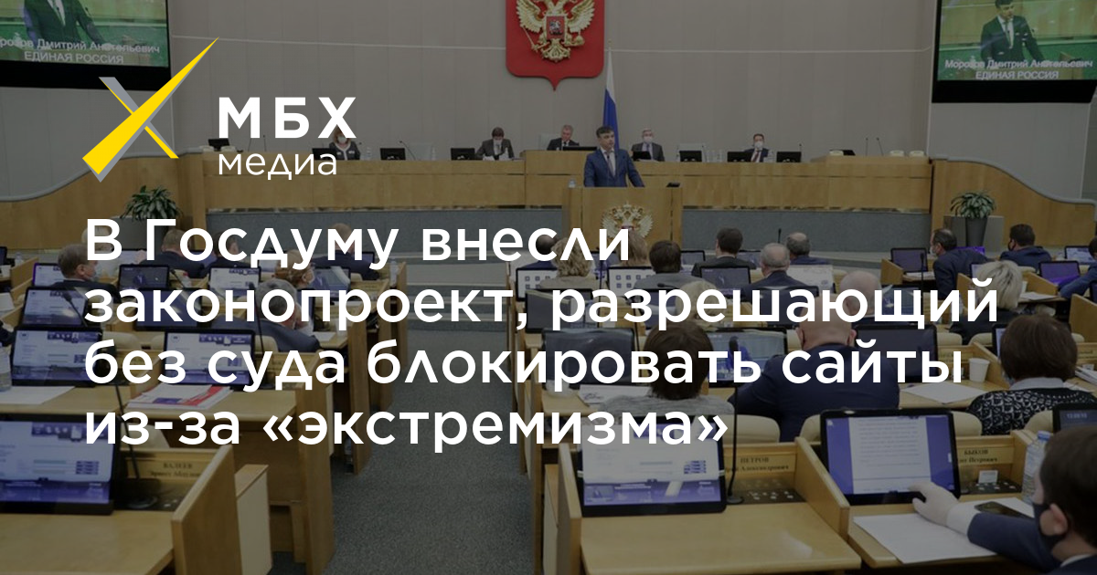 В Госдуму внесли законопроект, разрешающий блокировку сайтов из-за «экстремизма» без суда на основании заключения эксперта. Документ опубликован в базе данных Госдумы.