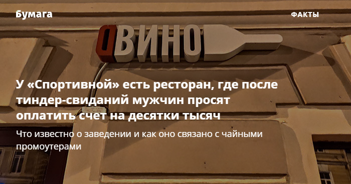 Петербуржцы жалуются на мошенничество в ресторане «О, вино!» на Кадетской линии, 31 (угол с набережной Макарова). Как один из пострадавших рассказал «Бумаге», его в «О, вино!» пригласила девушка, с которой он познакомился в «Тиндере». За ужин в заведении он заплатил почти 18 тысяч рублей.