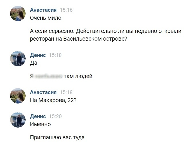 «Бумага» не смогла дозвониться по номеру, с которого девушка общалась с Игорем: телефон был отключен. В привязанном к номеру телеграм-аккаунте сказано, что последний раз пользовательница была онлайн около месяца назад. «Бумага» нашла во «ВКонтакте» страницу, которая, предположительно, принадлежит той же девушке, но после вопроса о ресторане «О, вино!» пользовательница ограничила возможность отправлять ей сообщения.