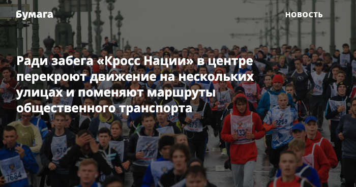 В Петербурге 19 сентября пройдет Всероссийский день бега «Кросс Нации — 2020». Ради него на многих центральных улицах города перекроют движение и поменяют движение общественного транспорта. Об этом сообщает комитет по развитию транспортной инфраструктуры.