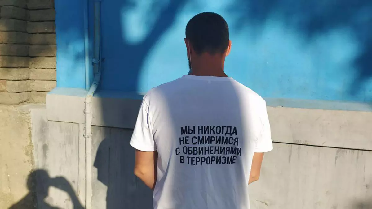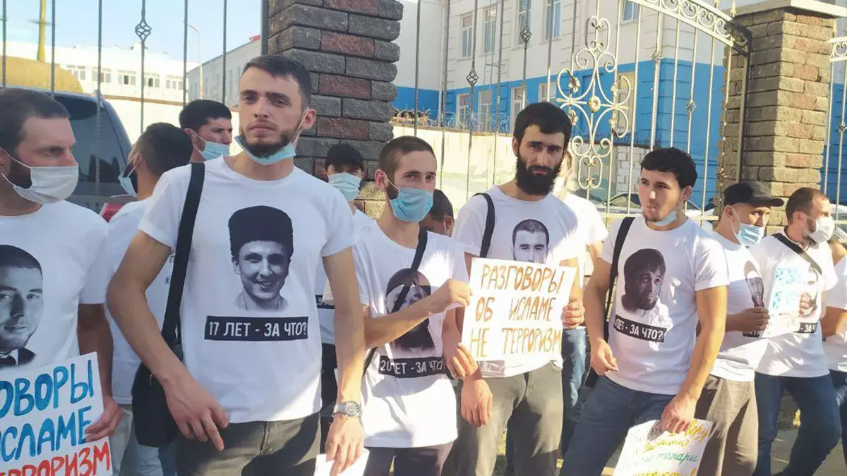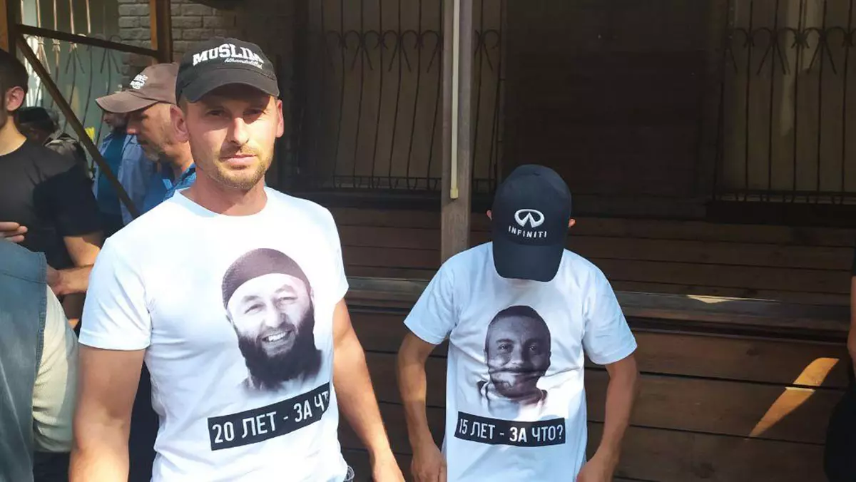 У ворот суда стоят сотни татар в ожидании приговора. Несколько мужчин раздают пирожки и воду уставшим с дороги землякам. Часть из присутствующих — в майках с надписью «мы никогда не смиримся с обвинениями в терроризме» на спине и фотографиями подсудимых с вопросом «20 ЛЕТ — ЗА ЧТО?» на груди. Они выстраиваются в колонну у здания военной части рядом с судом. Каждый второй стоит спиной к улице. Своеобразный флэшмоб растягивается на несколько сотен метров. Еще несколько человек стоит у входа на территорию суда с плакатами в поддержку подсудимых. «Разговоры об исламе — не терроризм», — гласит надпись на одном из них.