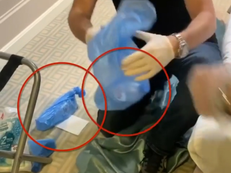 "В этот момент была сделана единственно возможная вещь. Они вызвали адвоката, поднялись в номер, из которого только что выехал Навальный, и начали фиксировать, описывать и упаковывать все, что там нашли. В том числе и бутылки из-под гостиничной воды", - объяснили в ФБК. Этот процесс был зафиксирован на видео.