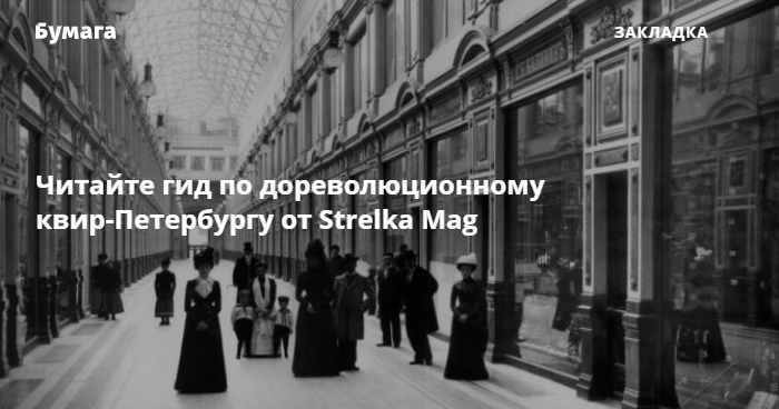 Основатель проекта «Тетки» Никита Андриянов составил маршрут по петербургским местам, в которых до революции встречались представители квир-сообщества. Список опубликовало издание Strelka Mag.