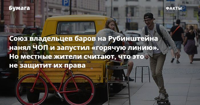 Анжелика Ефремова рассказала «Фонтанке», что союз нанял ЧОП для контроля за порядком на Рубинштейна. По ее словам, четыре охранника с 15 августа патрулируют улицу по пятницам и субботам с 20 часов вечера до 8 утра: они разгоняют неправильно припаркованные машины и вызывают полицию, если замечают нарушения правопорядка.