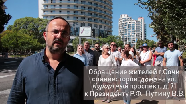 - По версии властей Сочи, изначально ответственные за строительство ЖК «Театральный» получили в 2012 году разрешение на возведение здания высотой в пять этажей, однако за несколько лет комплекс разросся до 13 этажа. В 2015 год суд обязал застройщика демонтировать «незаконно возведенные» этажи. Покупатели квартир в ЖК, называющие себя соинвесторами, выражают несогласие со сносом помещений. В сентябре протестующие опубликовали обращение к президенту Путину.