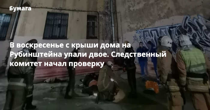 В воскресенье 20 сентября с крыши дома на Рубинштейна, 23 упали парень и девушка. Следственный комитет начал проверку, сообщили «Бумаге» в пресс-службе ведомства.