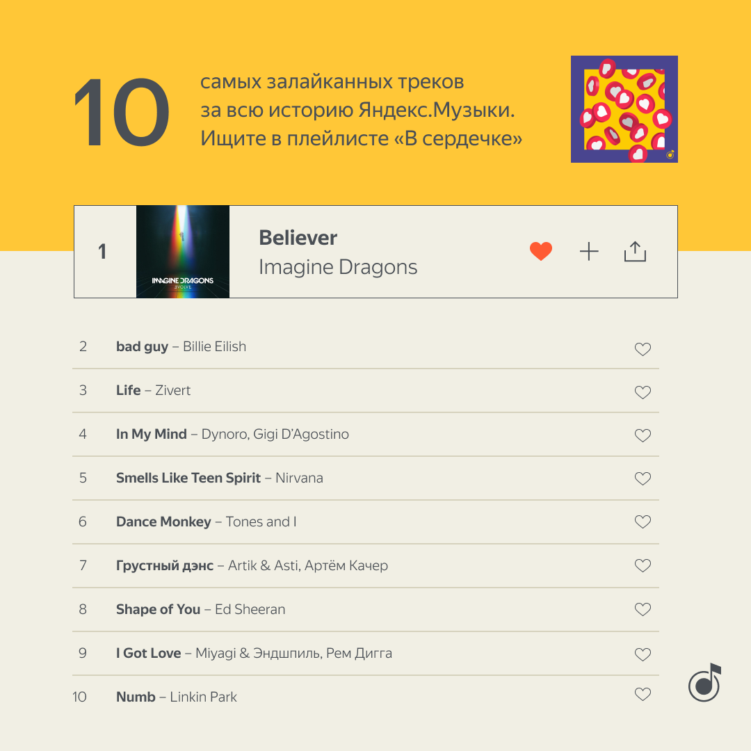 К юбилею сервис также составил список из 10 композиций, которые получили больше всего лайков за время существования «Яндекс.Музыки».