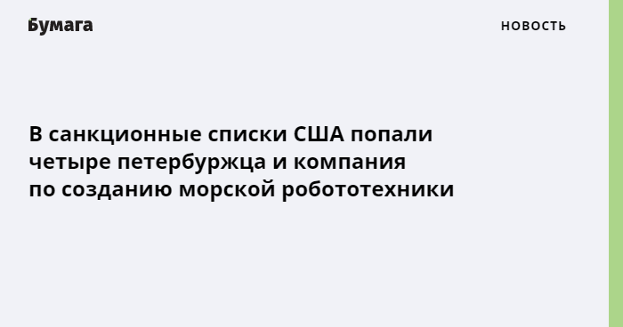 Согласно сообщению минфина, четверо попавших под санкции — из Петербурга. Это Борис Гайкович, Елена Иванова, Надежда Кучумова и Владислав Занин. По данным США, они связаны с петербургской компанией по созданию морской робототехники «Океанос», которую также включили в новый пакет санкций.