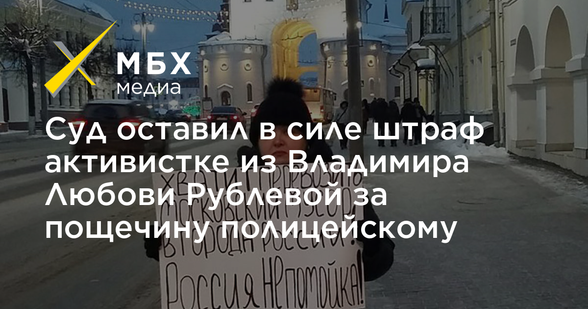 Владимирский областной суд оставил без изменения приговор бывшей сотруднице конной полиции Любови Рублевой, приговоренной к штрафу в 75 тысяч рублей за пощечину майору полиции Алексею Хомякову, незаконно задержавшему ее сына во время одиночного пикета. Об этом «МБХ медиа» сообщил координатор «Правозащиты Открытки» Алексей Прянишников.