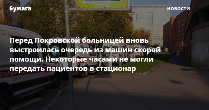 Источник в Покровской больнице сообщил, что длинные очереди из машин скорой помощи выстраивались минимум 10, 14 и 23 сентября. Примерно с 15 сентября сотрудники вынуждены размещать пациентов в коридорах, добавил собеседник «Бумаги».