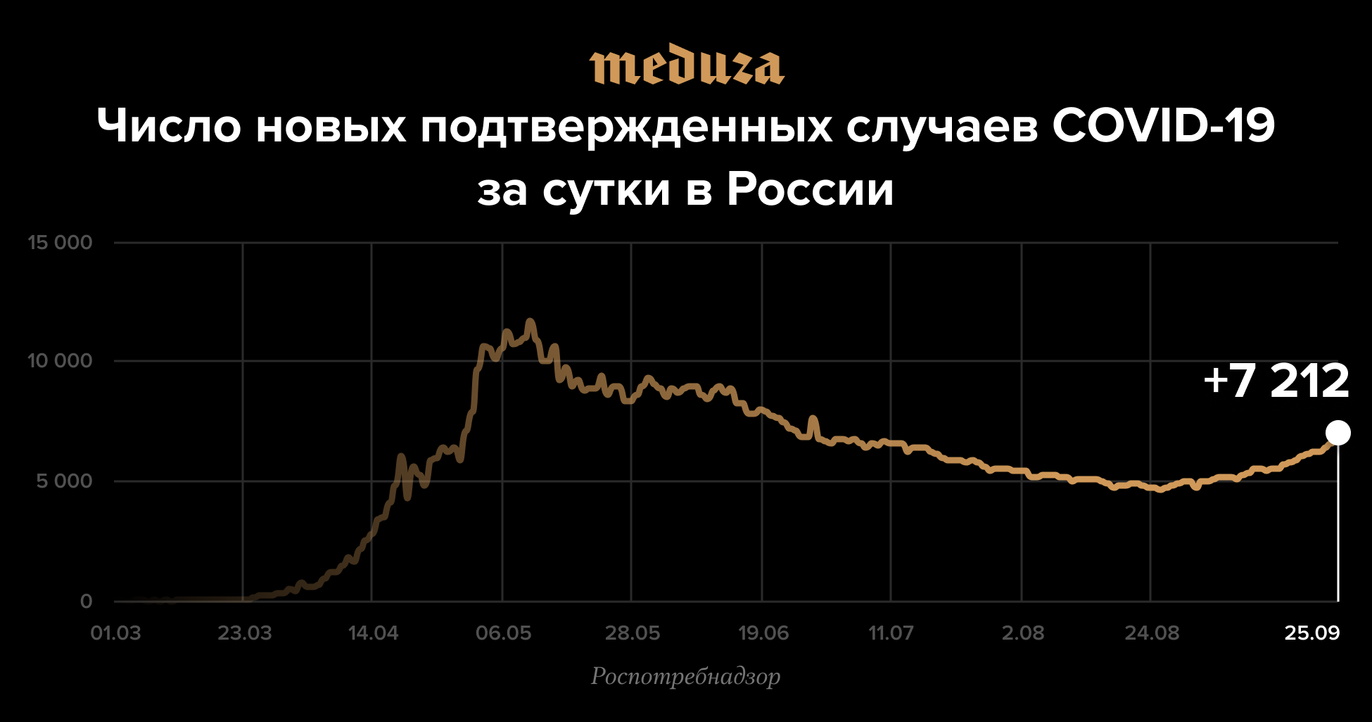 В России за сутки выявили максимум новых случаев COVID-19 за три месяца: заболели 7212 человек, на 617 больше, чем вчера. В Москве число заражений по сравнению с вчерашним днем выросло на треть: выявили 1560 случаев ковида. Всего с начала пандемии в стране заболели 1 136 048 человек. За сутки из больниц выписали 4317 пациентов с ковидом. За все время выздоровели 934 146 человек. За сутки умерли 108 человек, всего — 20 056 человек. Заболели мэр Салехарда Алексей Титовский и главный дирижер Пермского театра оперы и балета Артем Абашев. Смотрите, график пошел вверх.
