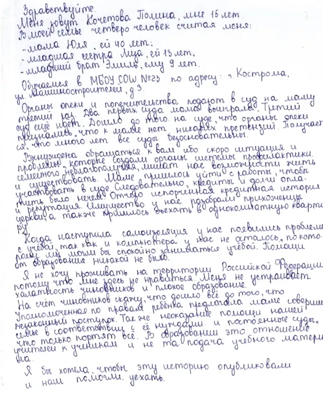 Юлия настаивает на том, что не «вовлекает» Полину в переписку с госорганами — это самостоятельная инициатива дочери. В официальных письмах о помощи, которые вызвали недовольство опеки, девушка рассказывала о том, что ее мама страдает от голода, об отсутствии постоянного места жительства, о нежелании общаться с бабушкой, дедушкой и отцом, которые ее избивали в детстве.