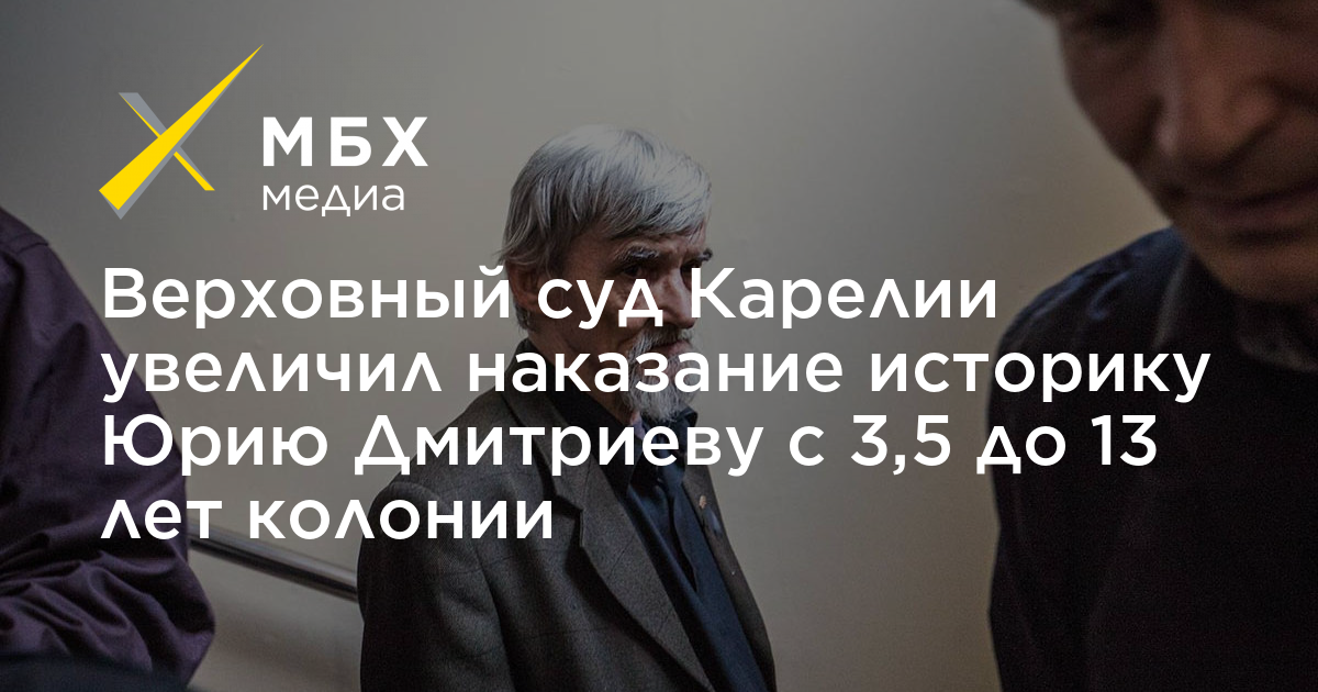 Верховный суд Карелии изменил приговор главе карельского «Мемориала» историку Юрию Дмитриеву, увеличив срок до 13 лет лишения свободы. Об этом сообщает корреспондент «Северо-Запад. МБХ медиа».