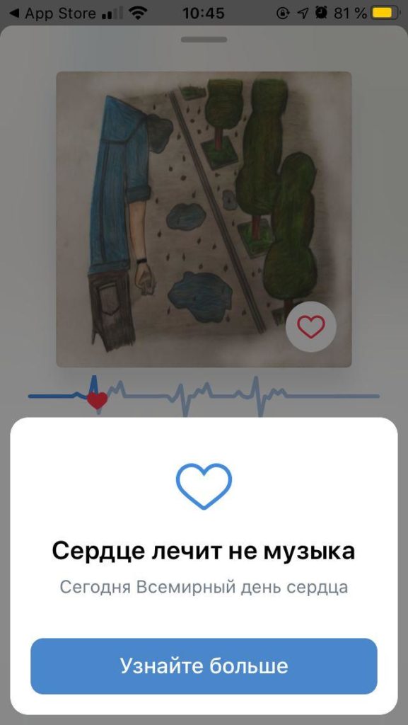 В музыкальном плеере «ВКонтакте» полоса перемотки аудиозаписи превратилась в кардиограмму, а ползунок стал в виде сердца. На обложке трека появилась особая кнопка, которая открывает статью с рекомендациями по профилактике сердечно-сосудистых заболеваний. Их соцсеть подготовила совместно с Всемирной организацией здравоохранения (ВОЗ).
