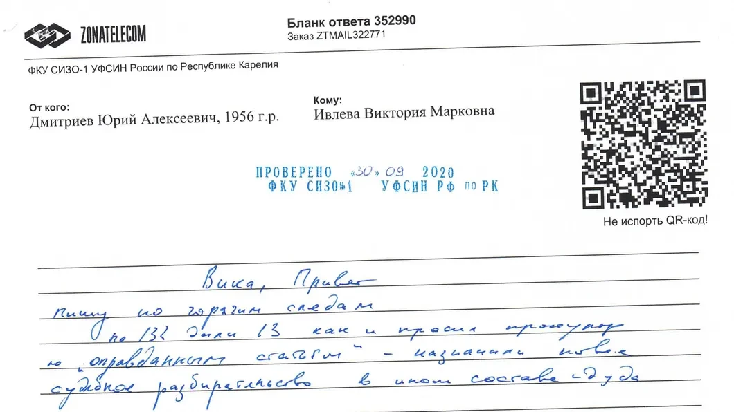 Письмо Юрия Дмитриева после решения Верховного суда Карелии