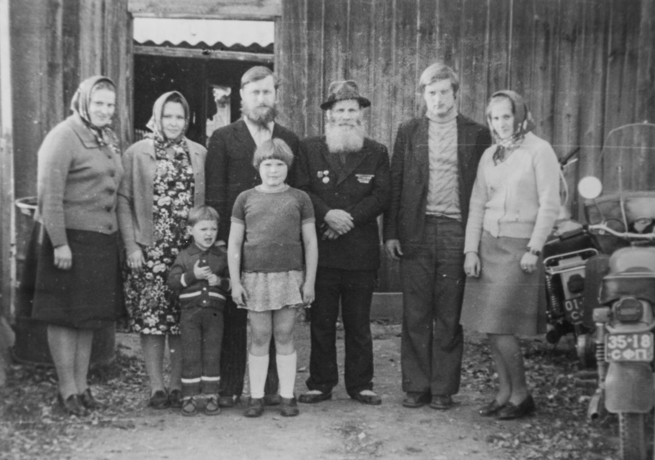 В гостях у дяди Памфила, 21.09.1980 (о. Леонтий в середине за детьми)Фото: архив отца Леонтия/Федор Телков Когда я работал, на демонстрации не ходил. Не боялся — ну накажут и накажут. На меня шибко и не давили. Видимо, уже шло потепление к вере. Начальник был у нас не очень придирчивый, они все шутками со мной. Шутили все в мой адрес. Я обедать домой бегал, мне недалеко было. Приду обратно, а они мне говорят: «Леня, а мы знаем, что ты сейчас ел!» Говорю: «Как вы знаете?» А у меня мойва на бороде висит. Я в столовую не ходил, дома питался, это был религиозный вопрос.