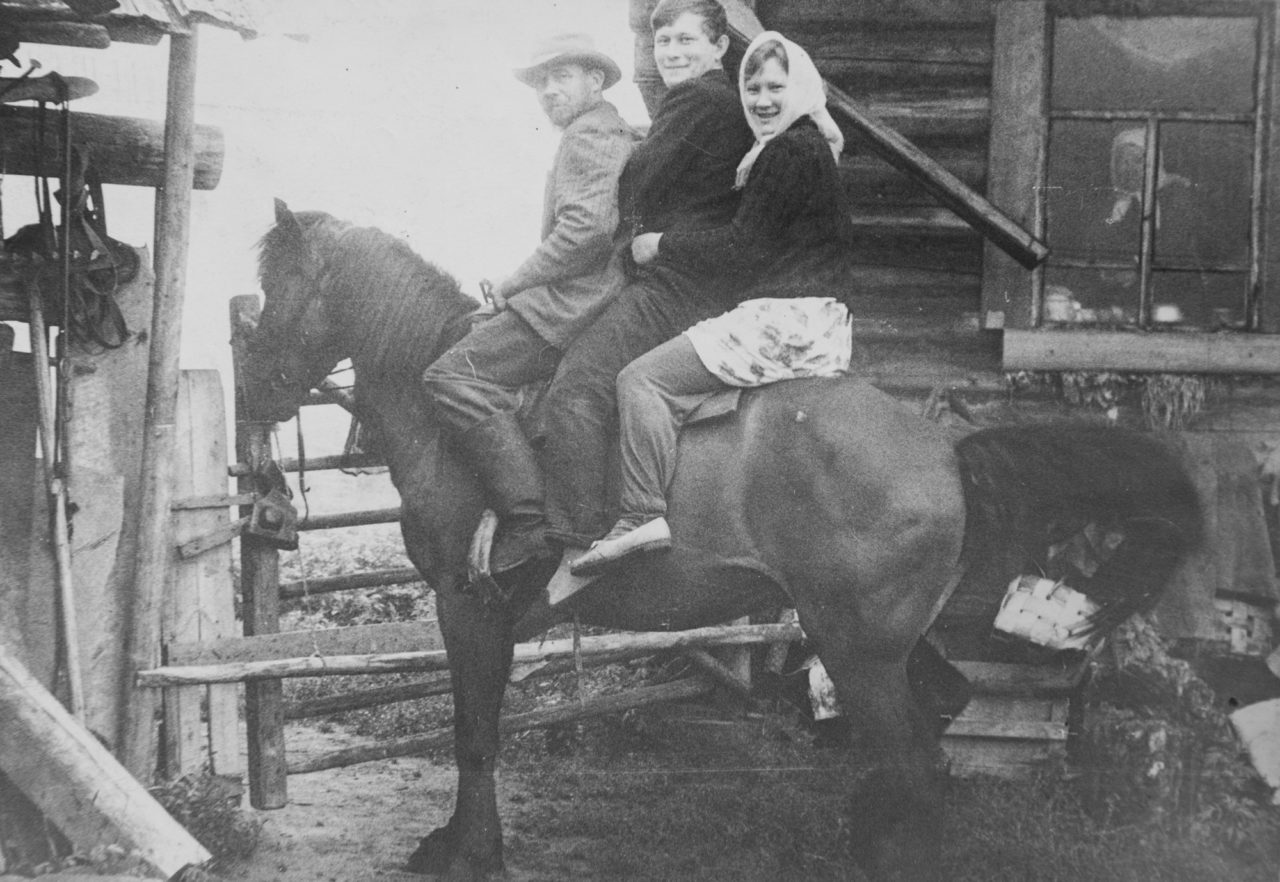 Сибирь, в пос. Бурном, 1967 г. (о. Леонтий на лошади в середине)Фото: архив отца Леонтия/Федор Телков Даже во время войны мама ездила в Лаю за орехами, за ягодами. Приехали, а там монашки-черноризцы жили в домах частных. И вот там матушка Антонина говорит: «Федорушка (обращается к матери), тебе охота, чтобы Александр-то пришел?» — «Матушка, миленькая! Мы же только перед войной сошлись!» Она говорит: «Молись: “Святый Славный Великомучениче Димитрий!” Придет!» И вот где бы мама ни была — молилась, со слезами, конечно. Пришел! Раненый, но пришел.