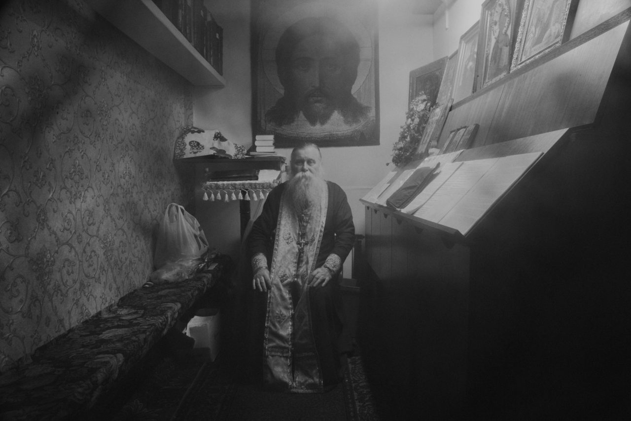 Портрет о. Леонтия в храме во имя святителя Николая Чудотворца, пос. Горбуново, 2020Фото: Федор Телков Бывало, встретишь в автобусе старообрядца такого закоренелого, он на тебя смотрит: «Какой ты никонианин-то стал!» А я усы не подрезаю, по внешности я такой же. Они, конечно, не приняли моего решения. Основной камень преткновения — в православной церкви «обливательное» крещение. Мы-то у себя крестим погружением, а они: «Что вы с обливанцами вместе, то вы заодно все равно!» Но даже если этот вопрос как-то решится, то они еще кучу вопросов найдут!