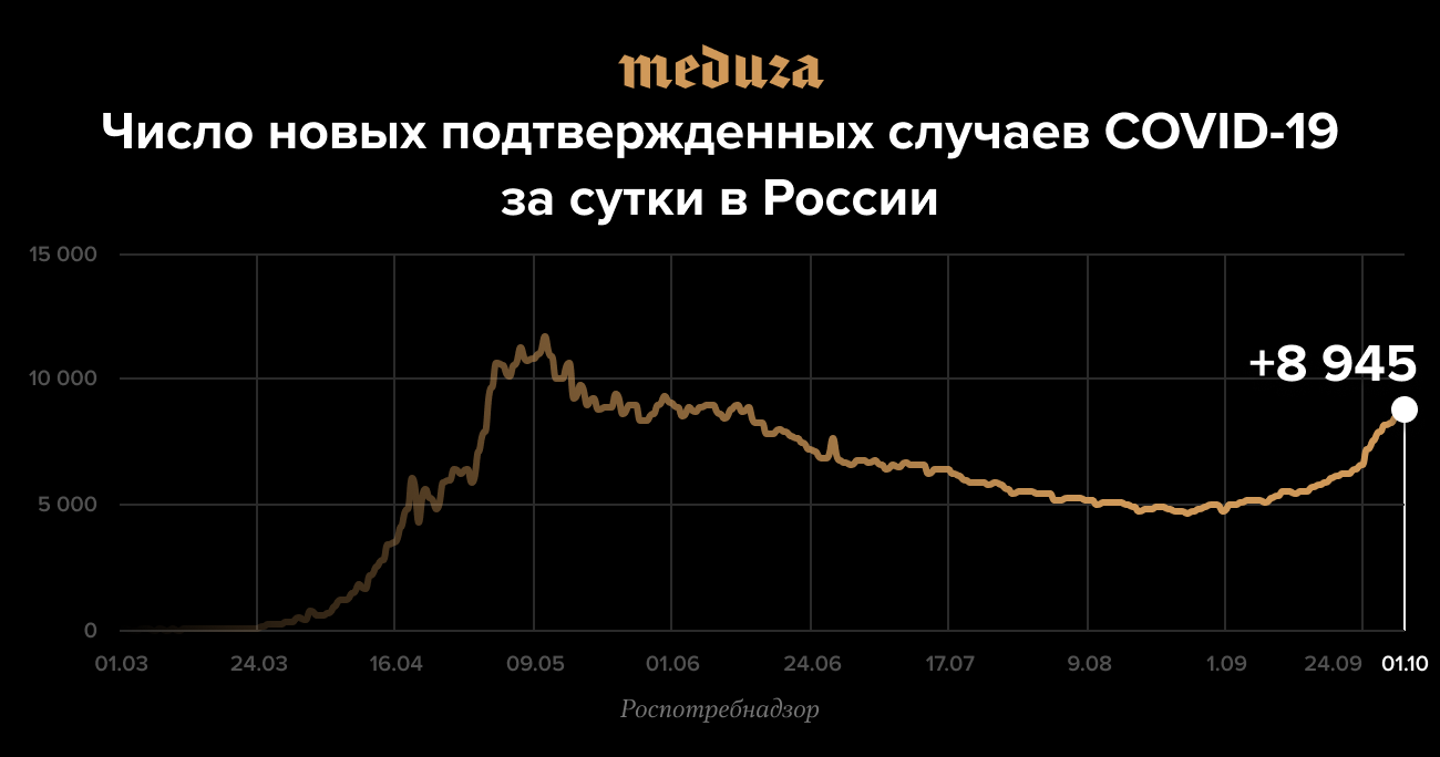 По состоянию на утро 1 октября в России зарегистрированы 8945 новых случаев коронавирусной инфекции. Это на 464 больше, чем днем ранее.