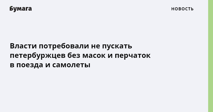Вице-губернатор Петербурга Максим Соколов сказал, что людей без СИЗ не будут пускать на объекты транспорта в Петербурге. Соблюдение правил обязаны обеспечить ОЖД, аэропорт Пулково, Северо-Западная пригородная пассажирская компании и все другие перевозчики, работающие по договорам с комитетом по транспорту.
