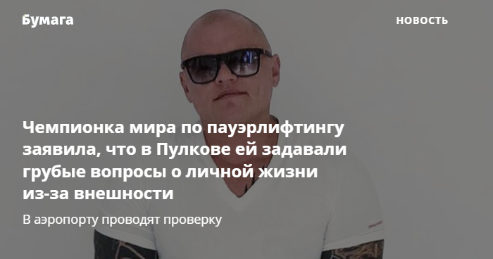Многократная чемпионка мира по пауэрлифтингу Анна Тураева рассказала, что в аэропорту Пулково ей задавали грубые вопросы интимного характера из-за внешности. Об этом она заявила в инстаграме.