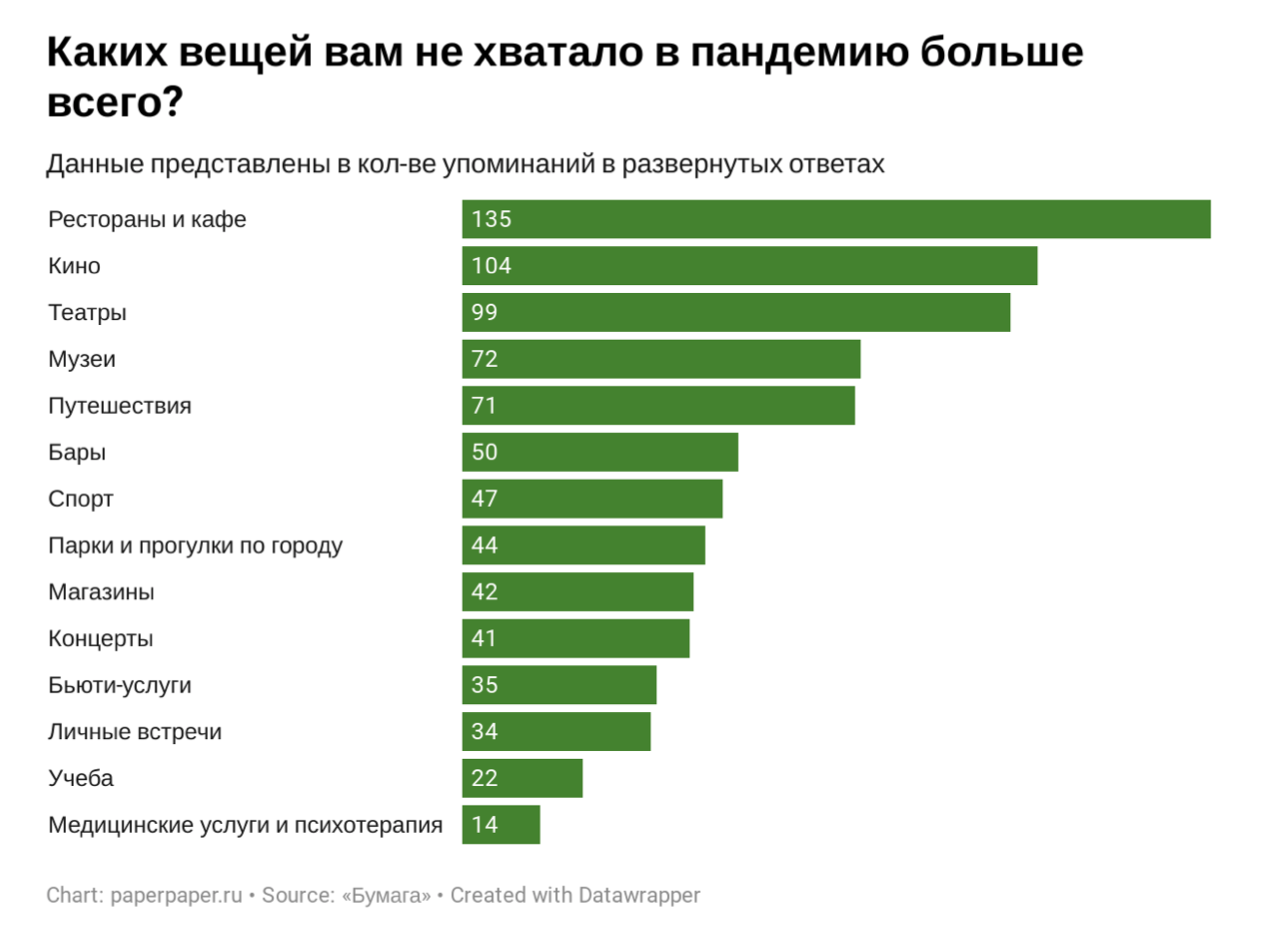 В опросе мы также задали открытый вопрос о том, чего больше всего не хватало в пандемию. Он был необязательным, на него ответили 433 человека. Чаще всего упоминались кафе и рестораны, кино, театры, музеи и путешествия. Меньше 10 % сказали, что скучали по личным встречам с друзьями, родственниками и возможности собраться в большой компании.