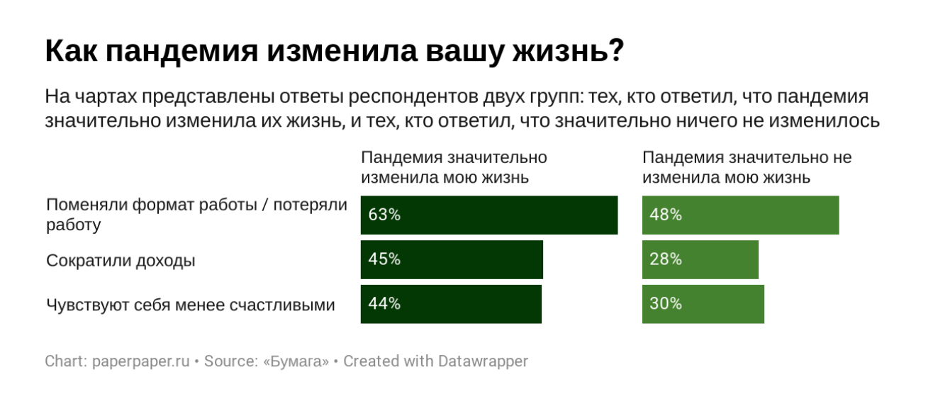 В целом, можно сказать, что пандемия скорее негативно сказалась на нас с вами. Изменения в жизни чаще всего были связаны с упавшими доходами, непривычным форматом работы, а также более низким внутренним уровнем счастья: 41 % респондентов сказали, что стали менее счастливыми.