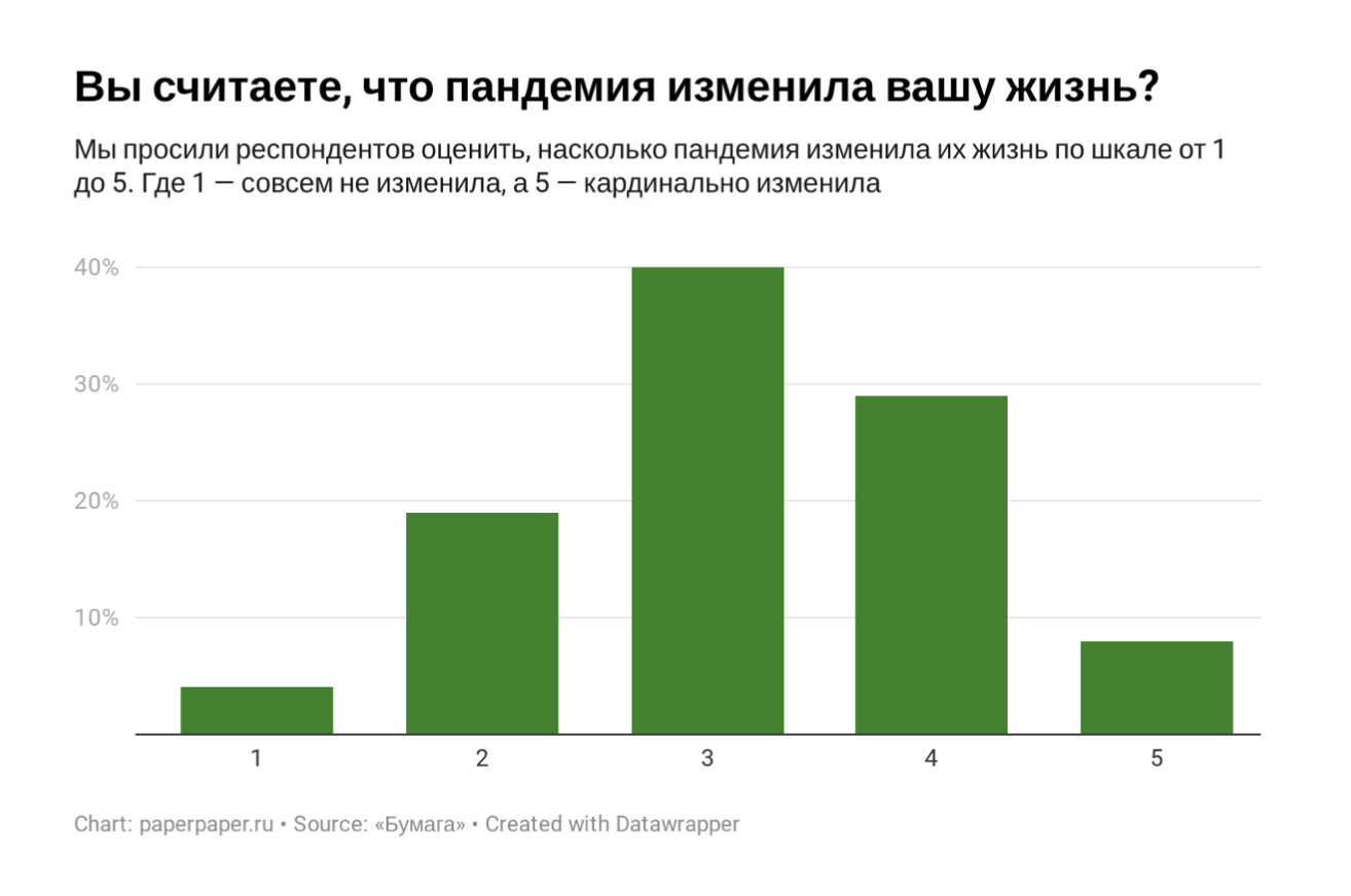 Пандемия заметно или сильно изменила жизнь: 77 % респондентов выбрали варианты от 3 до 5 по пятибалльной шкале, где 1 — «пандемия совсем не изменила мою жизнь», а 5 — «пандемия кардинально изменила мою жизнь».