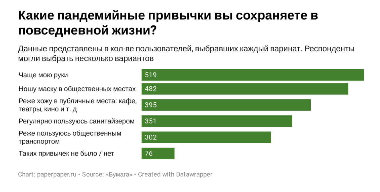 Многие респонденты отметили, что всё еще сохраняют те или иные привычки, приобретенные с началом пандемии. Большинство продолжает часто мыть руки, носить маску и реже бывать в общественных местах: