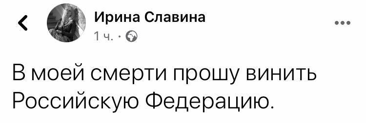 Baza и Telegram-канал «112» сообщают, что погибшая — главный редактор KozaPress Ирина Славина. Незадолго до происшествия она написала у себя в Facebook, что в своей смерти просит винить Российскую Федерацию.