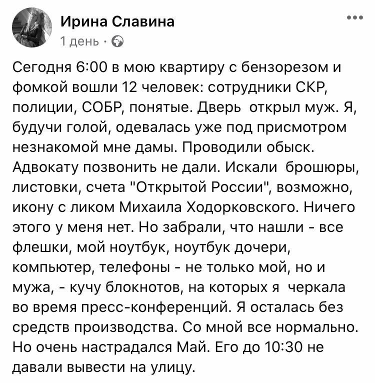 Накануне Славина сообщила, что у нее дома прошел обыск по уголовному делу о нежелательной организации (ст. 284.1 УК), которое завели в отношении нижегородского активиста Михаила Иосилевича. Главред KozaPress проходит по делу в качестве свидетеля. У нее изъяли компьютеры, телефоны и другие электронные носители информации.