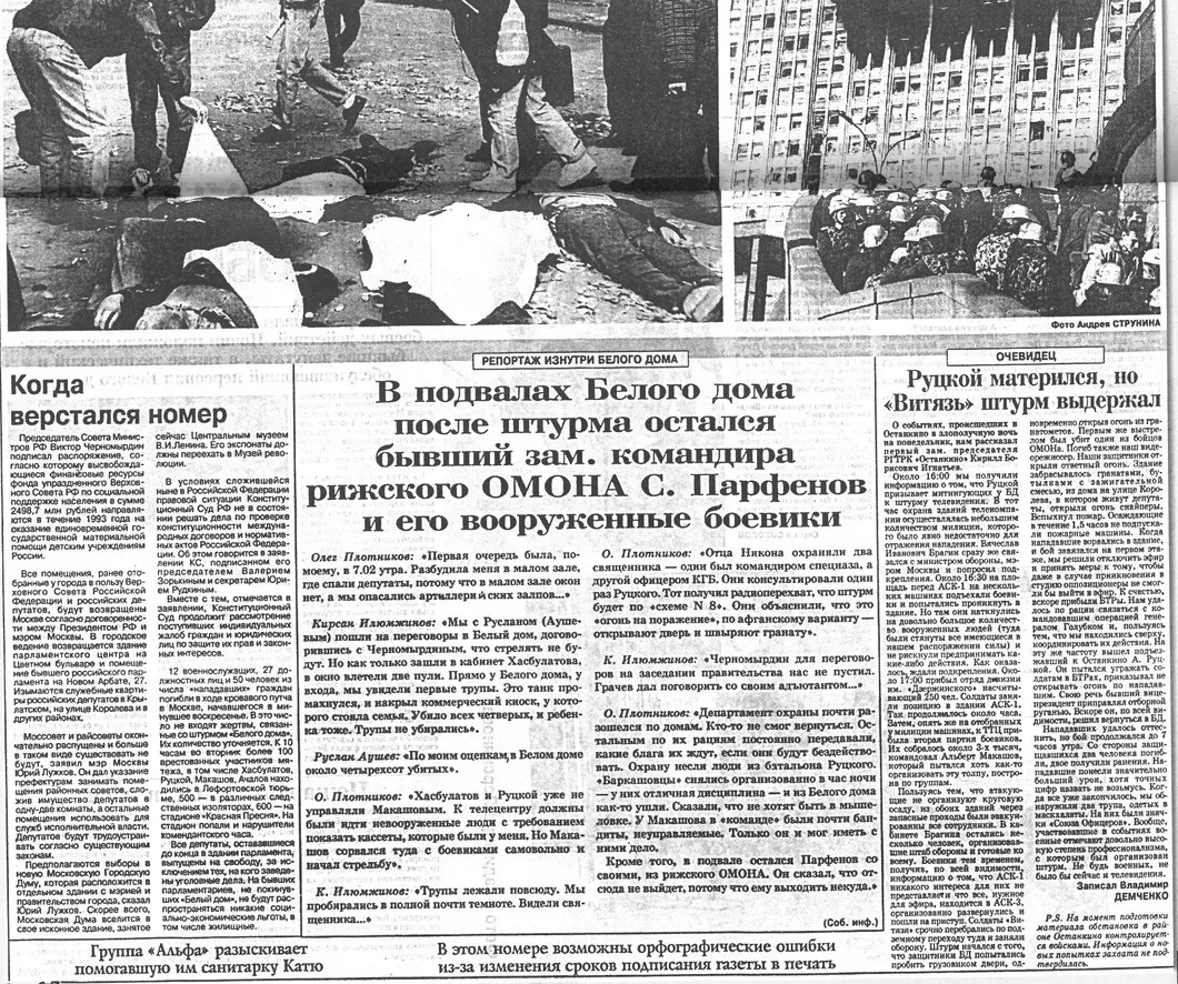 <…>Кирсан Илюмжинов: «Мы с Русланом (Аушевым) пошли на переговоры в Белый дома, договорившись, что стрелять не будут но как только зашли в кабинет Хасбулатова, в окно влетели две пули. Прямо у Белого дома, у входа, мы увидели первые трупы. Это танк промахнулся, накрыл коммерческий киоск, у которого стояла семья. Убило всего четверых, и ребенка тоже. Трупы не убирались».<…>Олег Плотников: «Отца Никона охраняли два священника — один был командиром спецназа, а другом офицером КГБ. Они консультировали один раз Руцкого. Тот получил радиоперехват, что штурм будет по «схеме №8». Они объяснили, что это «огонь на поражение», по афганскому варианту — открывают дверь и швыряют гранату».