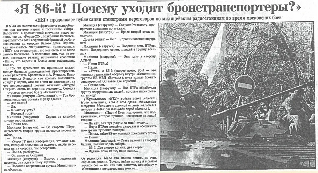 «Я 86-й! Почему уходят бронетранспортеры?». «НЕГ» продолжает публикации стенограмм переговоров по милицейским радиостанциям во время московских боев