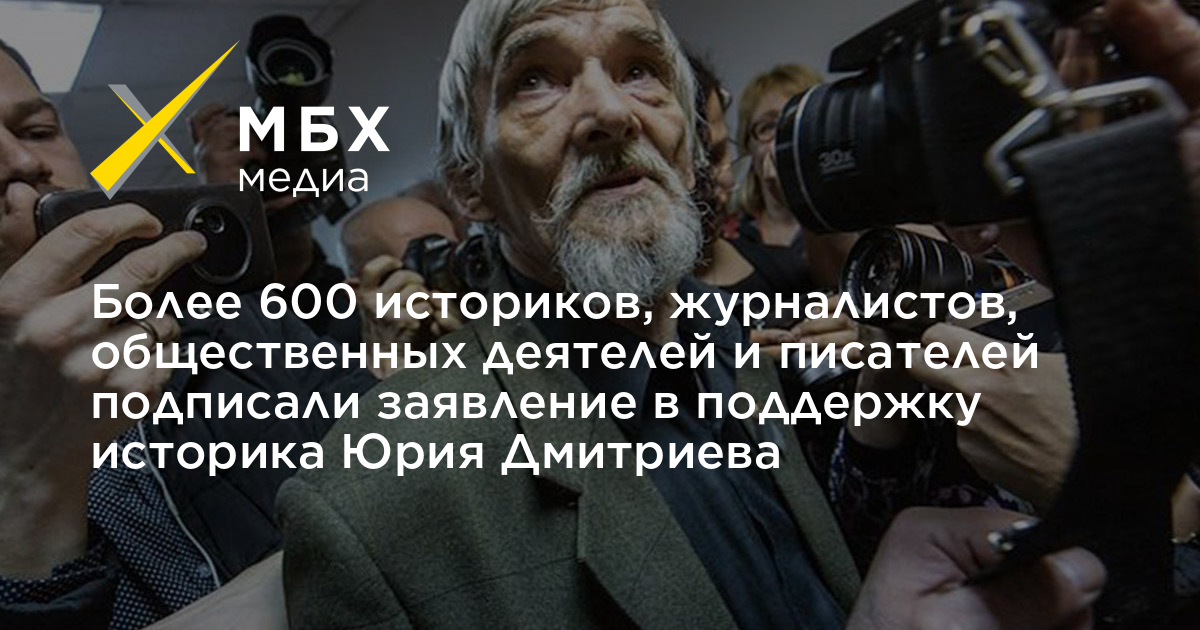 Более 600 правозащитников, историков, журналистов, общественных деятелей, писателей и режиссеров подписали заявление в поддержку историка Юрия Дмитриева, которому 29 сентября ужесточили наказание с 3,5 до 13 лет лишения свободы. Об этом «МБХ медиа» сообщили в Правозащитном совете Санкт-Петербурга.