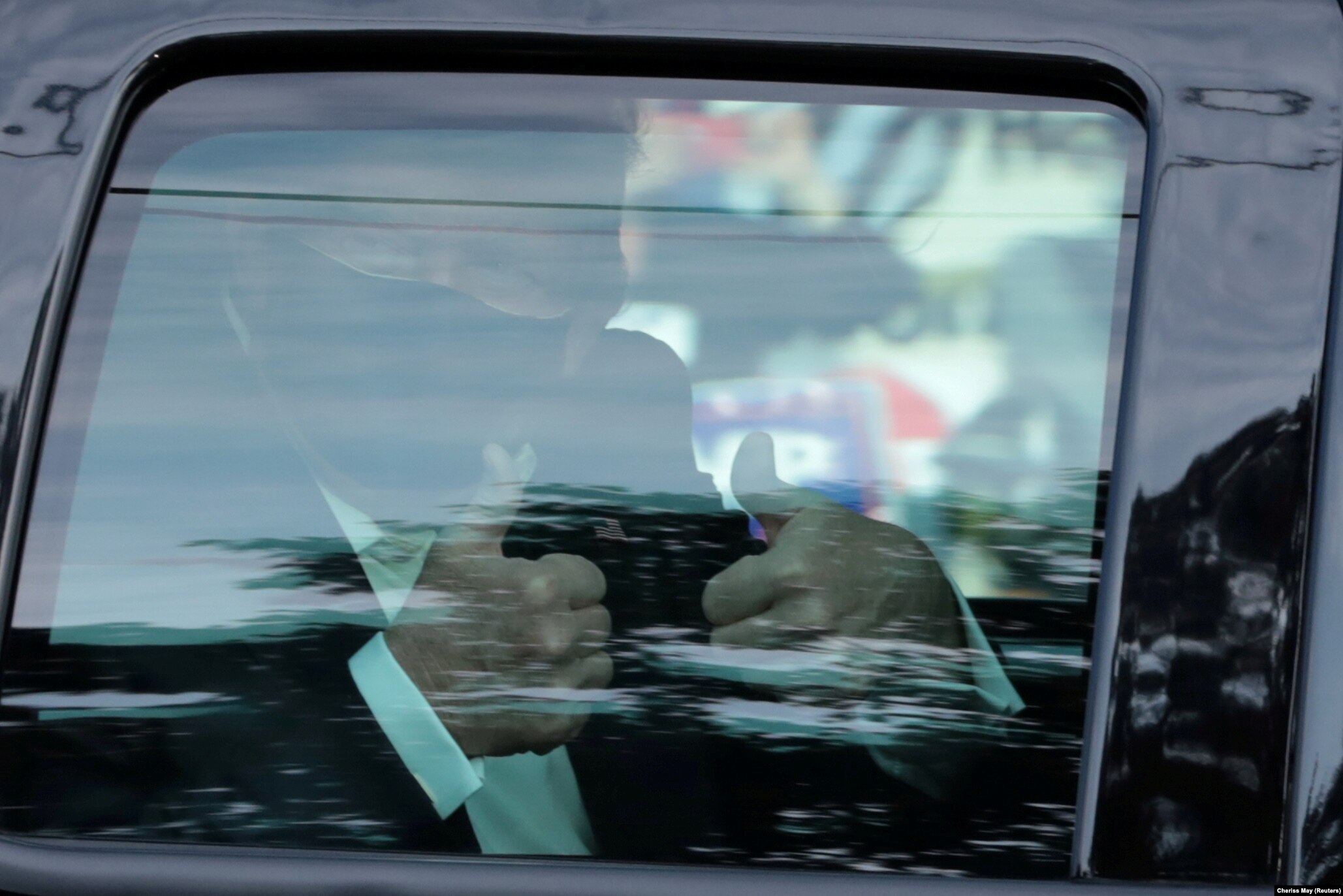 Трамп проехал перед ними в лимузине, из автомобиля он не выходил. После этого президент вернулся в госпиталь.