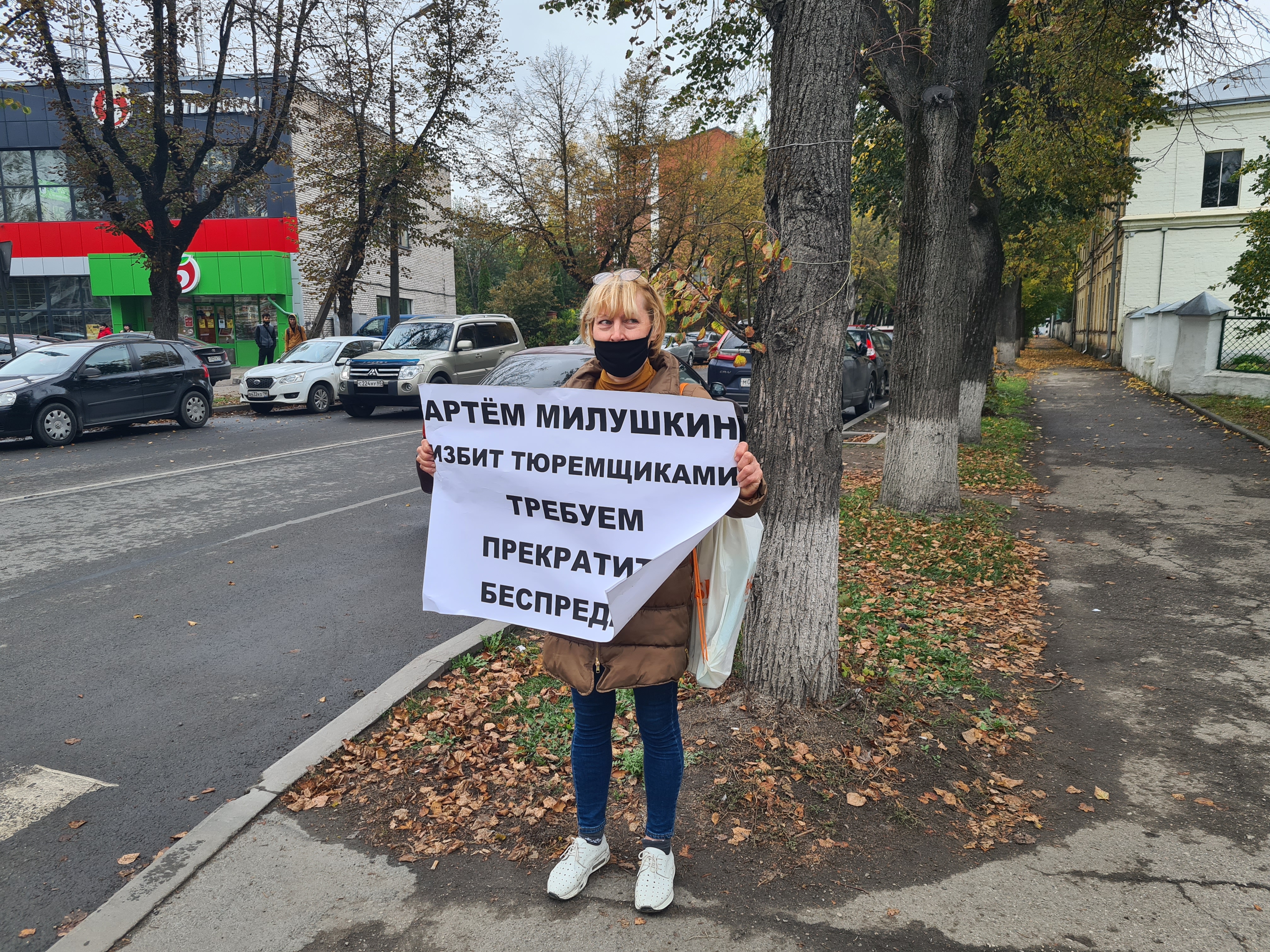 Женщина час простояла с плакатом "Артем Милушкин избит тюремщиками. Требуем прекратить беспредел", а затем встала с пикетом у церкви Покрова Пресвятой Богородицы, которая находится недалеко от СИЗО.