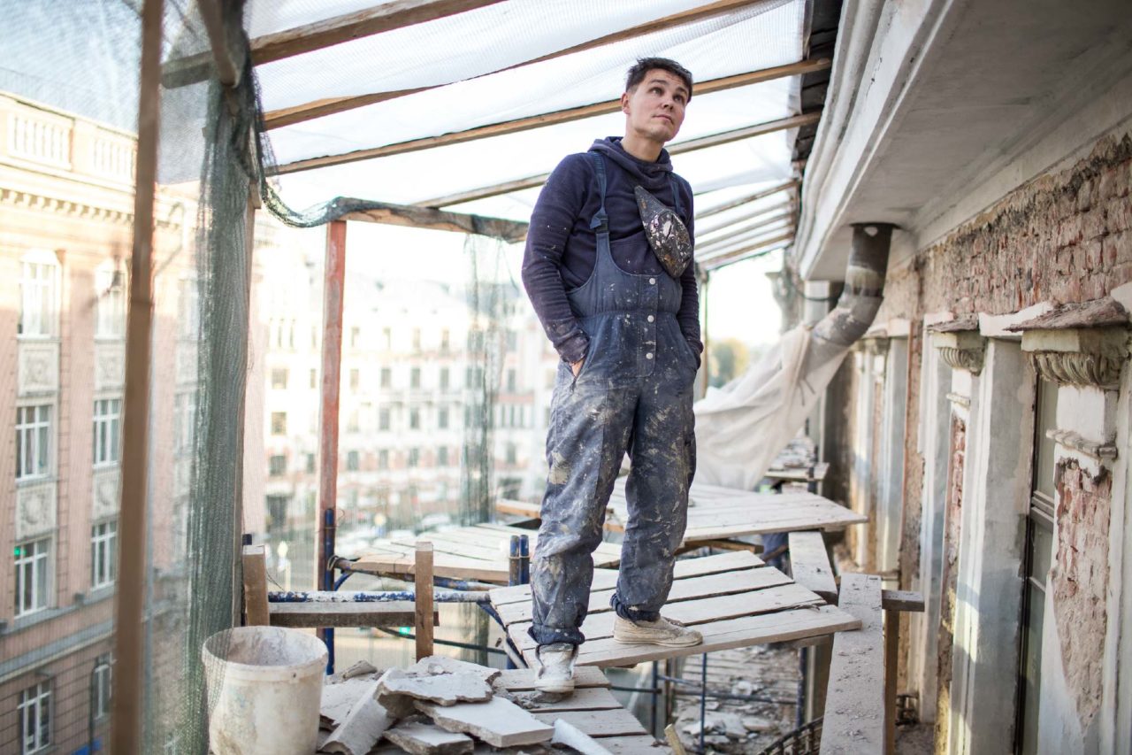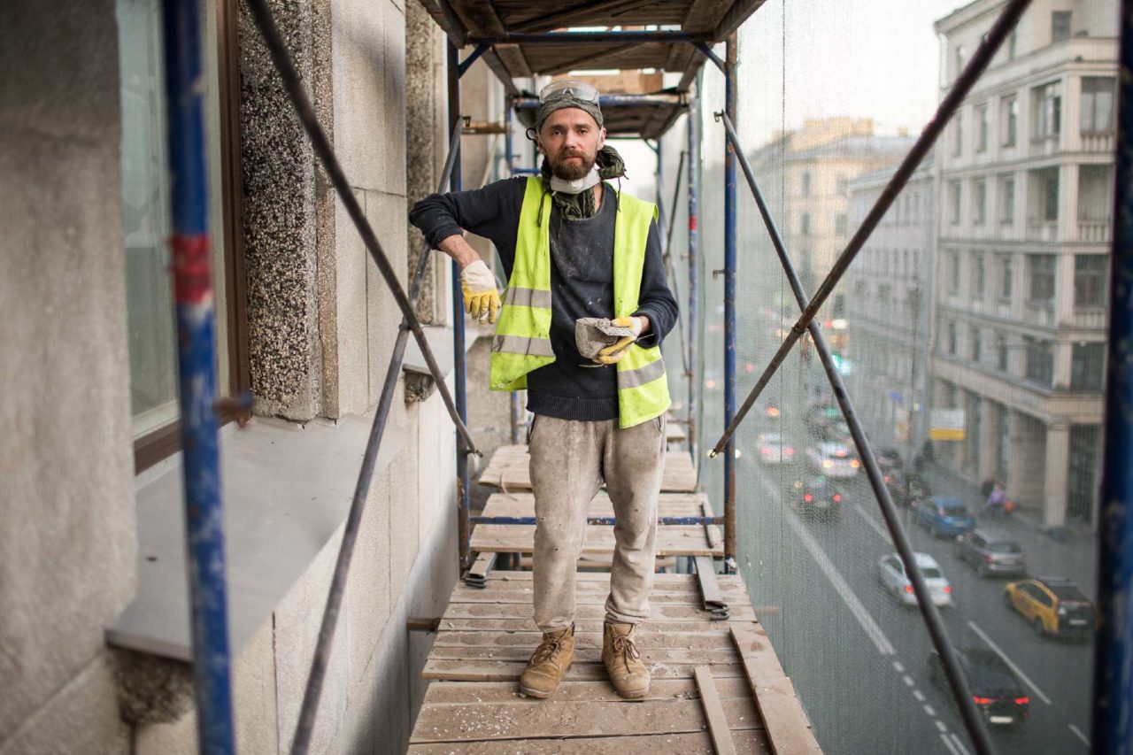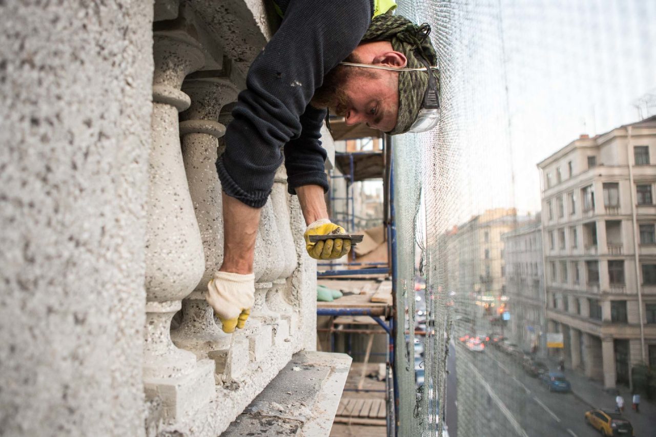 Новые «коллеги» просят не называть нашу работу стройкой. Тут, конечно, присутствуют все атрибуты, которые ассоциируются со строительством: оранжевые каски, гастарбайтеры из стран бывшего СССР и вагончик, в котором обедают и переодеваются. Однако мы строим не очередной ТРЦ, а реставрируем фасады зданий времен русских классиков.