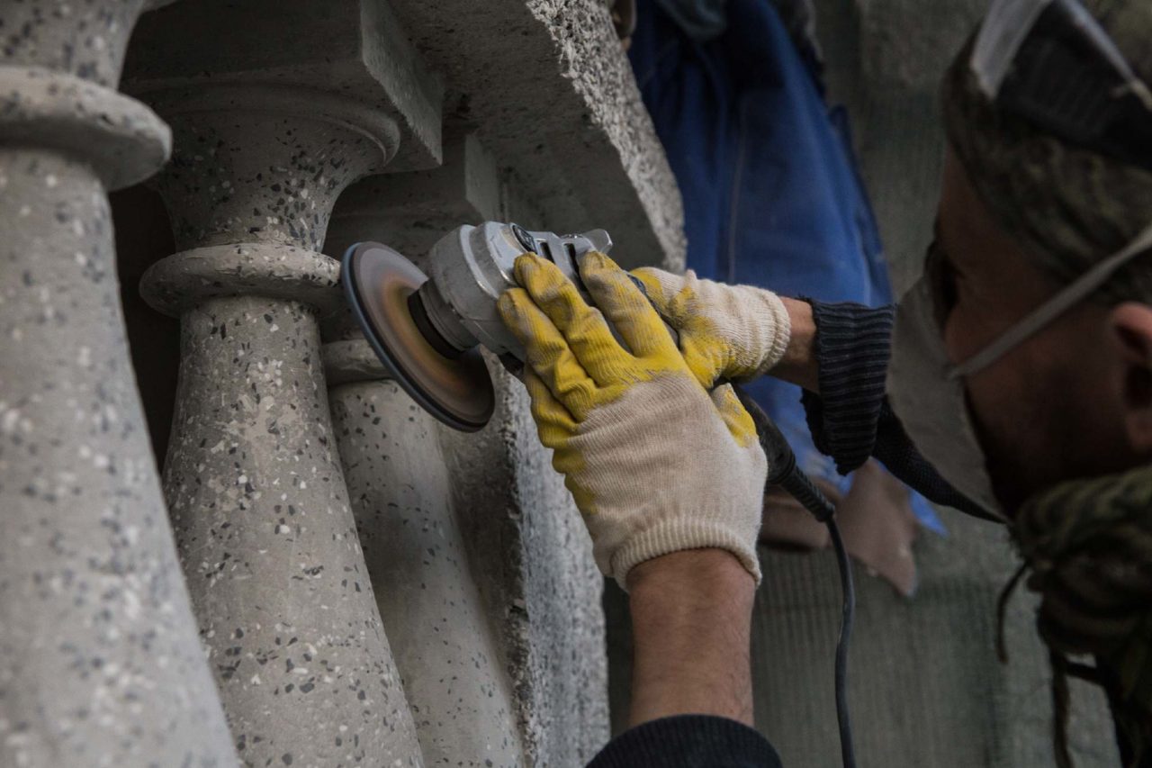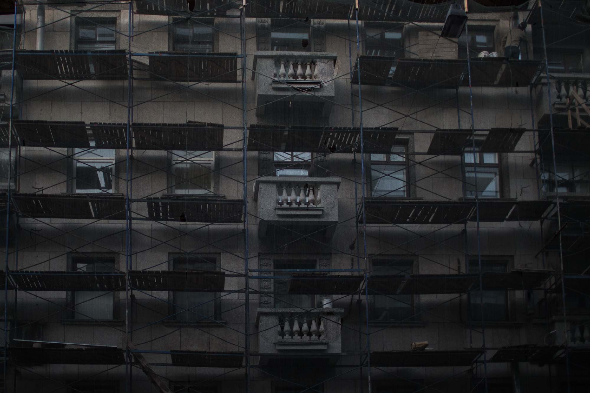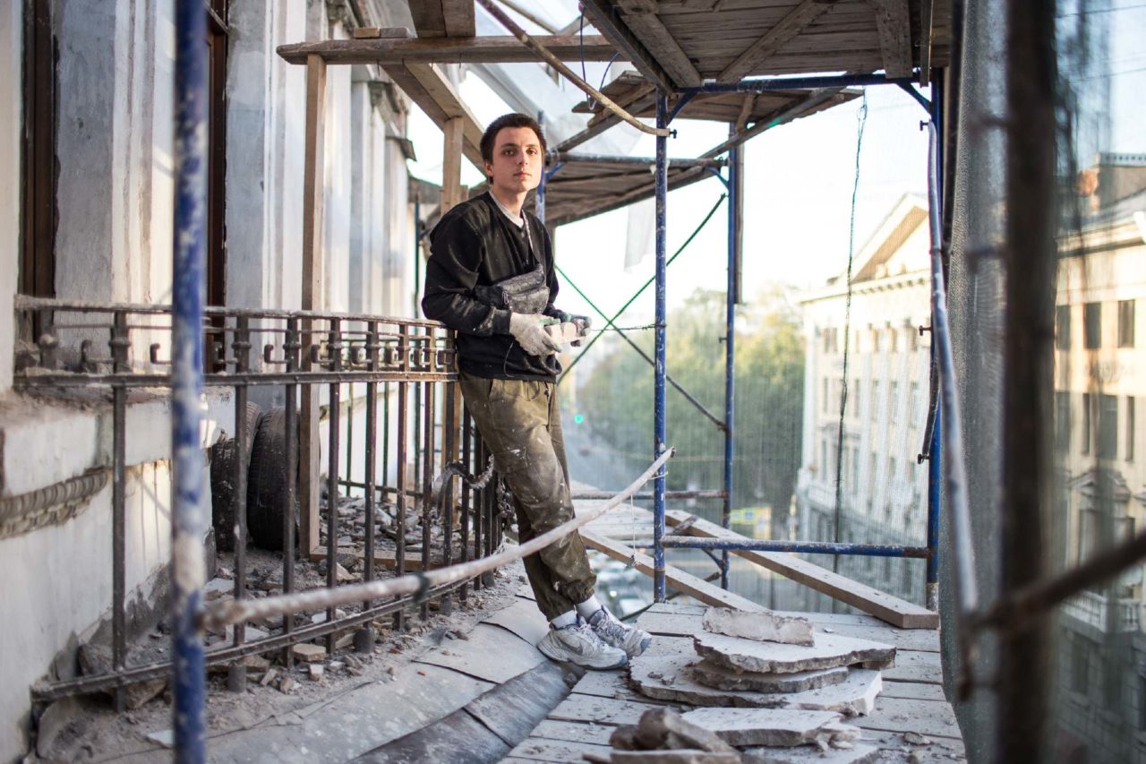 Новые «коллеги» просят не называть нашу работу стройкой. Тут, конечно, присутствуют все атрибуты, которые ассоциируются со строительством: оранжевые каски, гастарбайтеры из стран бывшего СССР и вагончик, в котором обедают и переодеваются. Однако мы строим не очередной ТРЦ, а реставрируем фасады зданий времен русских классиков.