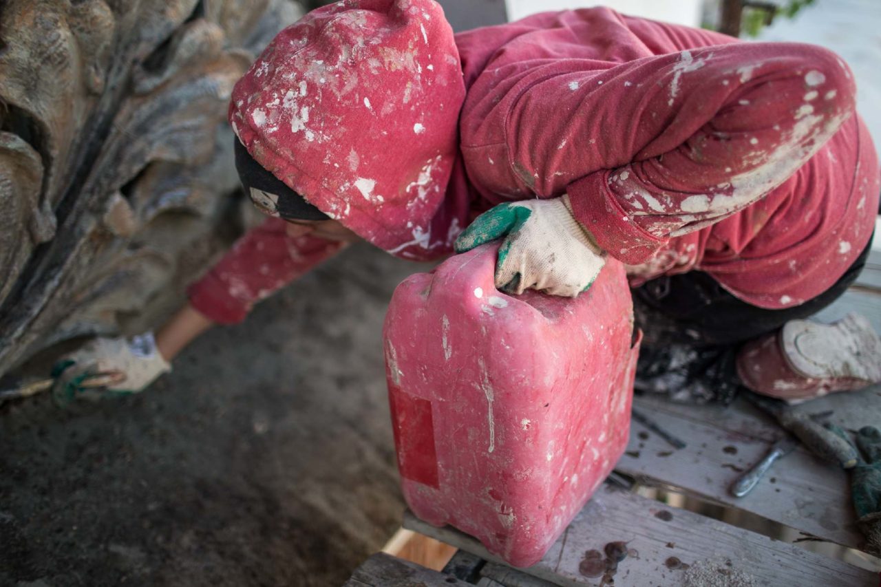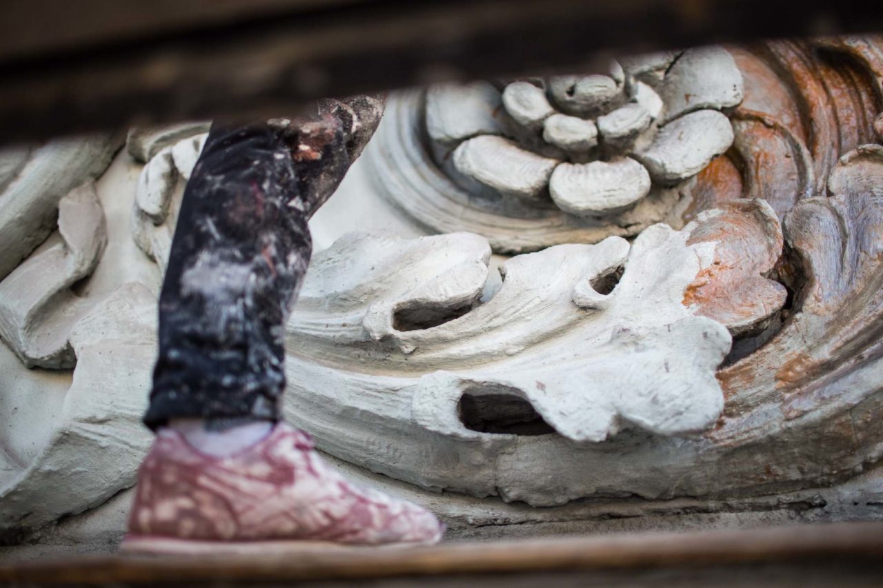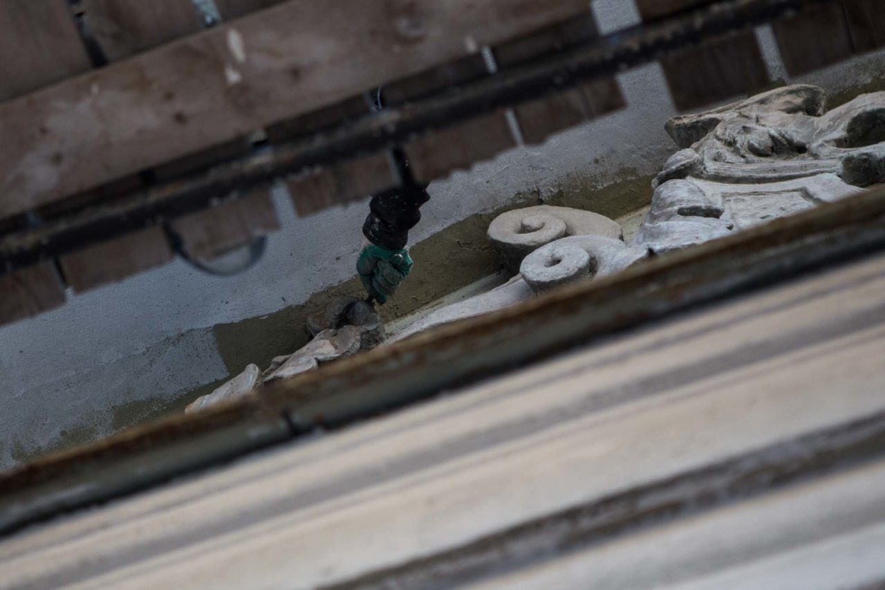 На этот случай матерые реставраторы любят рассказывать байку, которая передается из поколения в поколение еще с советских времен. Реставратор закладывает тухлое яйцо в один из элементов декора. Если после всех работ он не получает деньги, протыкает иглой место с сюрпризом — весь двор наполняется отвратительным запахом. Предотвратить его можно, разрушив весь фасад, потому что место с тайником знает только один человек. Тогда реставратор выдвигает свои условия: заказчик оплачивает его работу, а он показывает кронштейн со спрятанным яйцом. Это легенда. Реалии жизни выглядят жестче. Молодой человек написал письмо президенту, что реставрировал наследие страны, а ему не выплатили ни копейки. Больше его никто не видел. Все эти веселые и не очень истории мне рассказывают в полуосвещенном подвальном помещении — бывшие комнаты дворника, сейчас раздевалка рабочих. Первое время это, скорее, завораживает и манит, чем пугает.