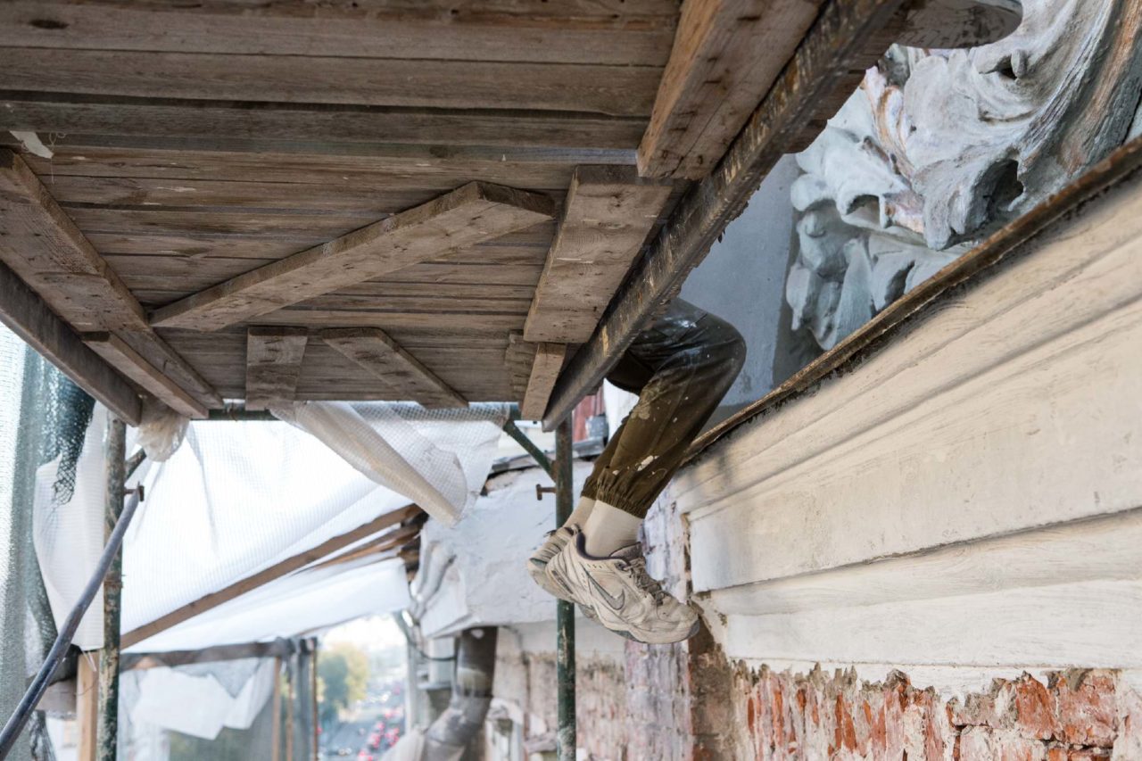 На строительных лесахФото: Алексей Лощилов для ТД «Романтизация реставрации происходит во многом из-за гипса. Это довольно интересный материал. Он из жидкого состояния за десять минут превращается в твердый камень — очень быстро можно создать любую форму. Первое время это кажется невероятным. Сейчас я уже не думаю, что в реставрации больше магии, чем в работе плотника. Я восхищаюсь любой работой, выполненной руками», — объясняет Антон.