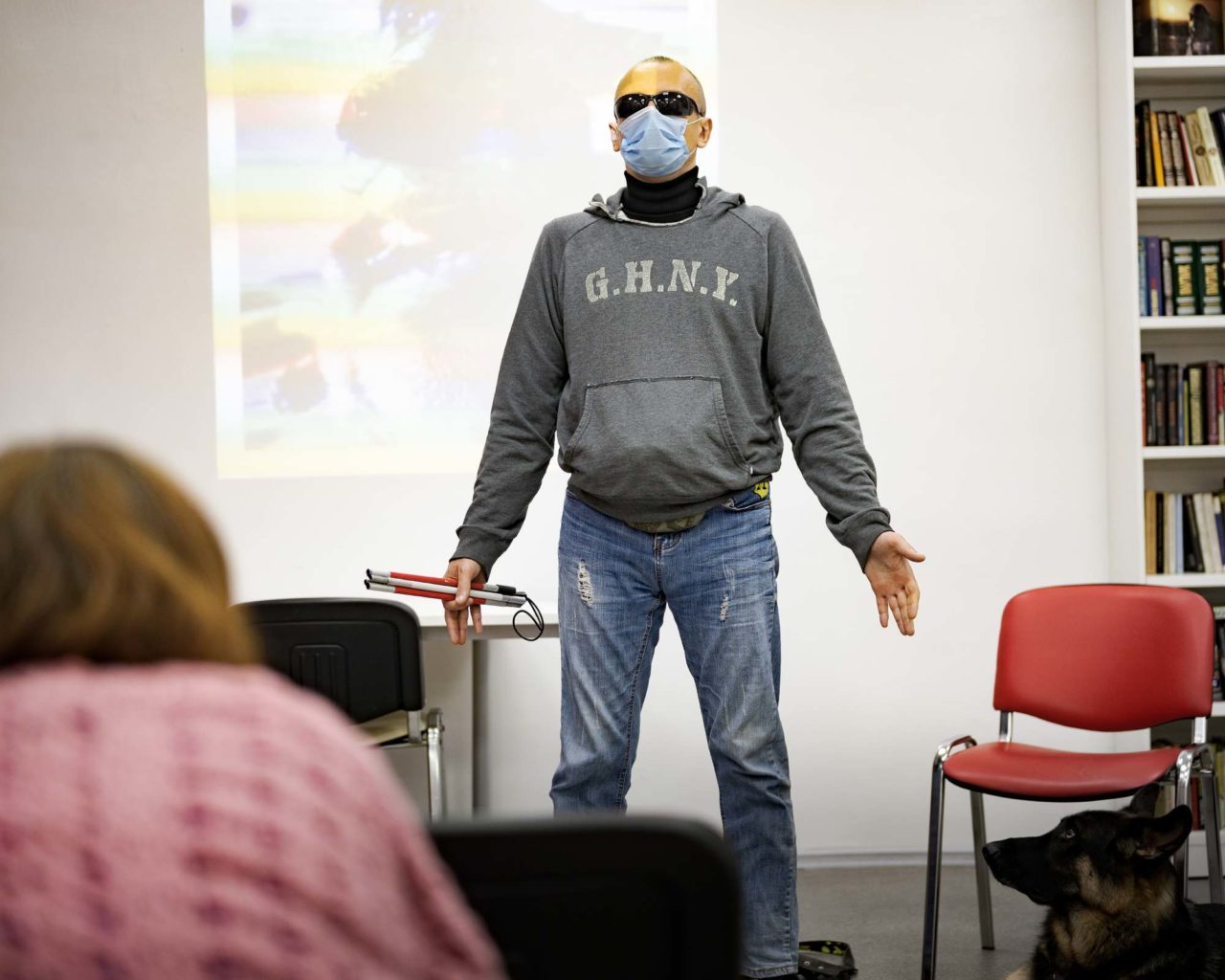 Дмитрий Голдман с Паркером в библиотеке № 48 на Алексеевской во время презентации фотовыставки, где он был главным героем. Дмитрий объясняет посетителям, каково быть незрячим, и отвечает на вопросы. Примечательно, что он давно сотрудничает с библиотекой и периодически проводит занятия с детьми, рассказывая о собаках-поводырях, давая детям возможность почувствовать себя на его местеФото: Стоян Васев для ТД «Понимаете, это ситуация, когда человека с ограничениями по здоровью ограничивают еще и внешние факторы. Бюрократические в том числе, — объясняет он. — Я отлично понимаю, что многим незрячим куда проще отказаться от каких-либо выходов в свет, чтобы спокойнее жилось. Многие и собак себе не берут, потому что с ними не везде пускают. Меня самого часто спрашивают: вот зачем слепому в зоопарк? Или зачем тащить с собой собаку, если рядом зрячие жена и сын? Но дело-то не в “зачем”, а в “имею право”. Я такой же человек, как и все остальные. У меня есть интересы, потребности. Людям, потерявшим зрение достаточно поздно, критически важно продолжать свою привычную социальную жизнь, чтобы не впасть в депрессию и не запереться в четырех стенах. А общество негласно считает, что инвалид по зрению должен жить своей “слепецкой”, то есть неактивной, не заметной для вас, какой-то иной жизнью. С чего бы?»