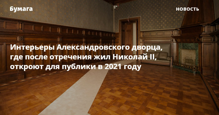 В числе интерьеров, которые откроет музей, — Сиреневый кабинет, Палисандровая гостиная, приемная, Мавританская уборная и камердинерская, парадный кабинет, Кленовая гостиная и залы библиотеки. В этих помещениях Николай II жил после отречения от престола до отъезда в ссылку в Тобольск летом 1917 года.