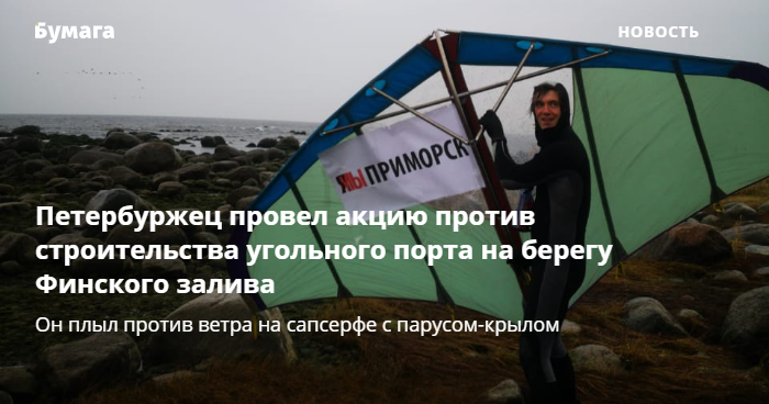 Петербуржец Павел Коваль провел акцию против строительства угольного порта на берегу Финского залива в районе Приморска. Об этом он сам рассказал «Бумаге».
