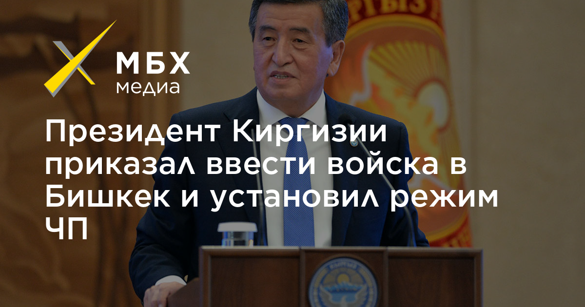 Президент Киргизии Сооронбай Жээнбеков отдал распоряжение ввести в Бишкек войска, а также ввел режим чрезвычайного положения в городе до 21 октября. Об этом сообщается на сайте президента Киргизии.