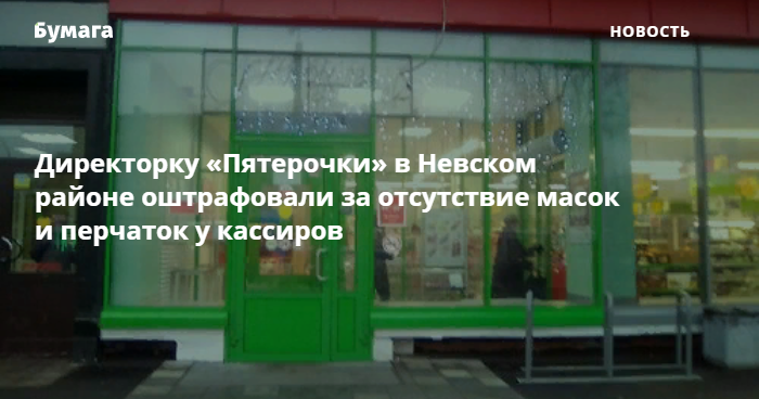 Директорку «Пятерочки» на Народной улице, 3 литера А Наталью Потякину оштрафовали за нарушение масочно-перчаточного режима и других ограничений против коронавируса в торговой точке.