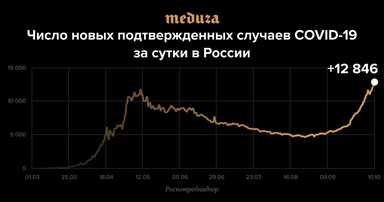 В России за минувшие сутки выявили 12 846 новых случаев коронавирусной инфекции. Днем ранее зарегистрировали 12 126 новых случаев, что стало предыдущим рекордным значением с начала пандемии.