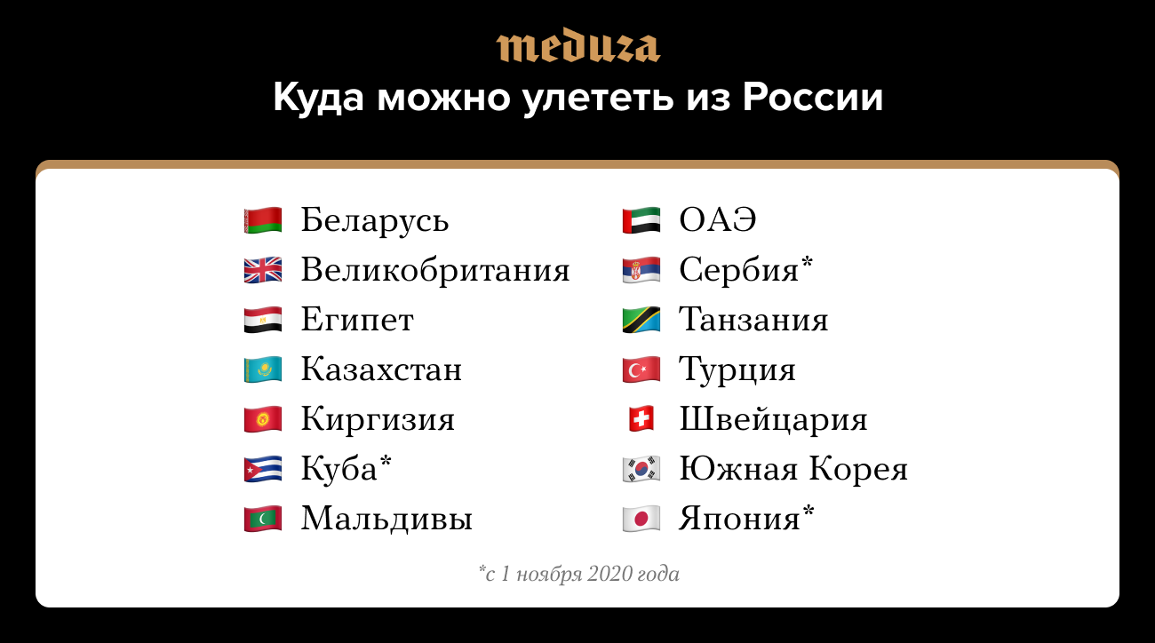 С 1 ноября Россия возобновит авиасообщение с Сербией, Кубой и Японией. Помимо этого, станет больше рейсов в Беларусь, Швейцарию, Объединенные Арабские Эмираты и на Мальдивы. Например, в неделю будет три рейса Москва — Минск вместо одного. Мы собрали в одну таблицу все страны, куда можно улететь, — и все, что для этого нужно иметь.