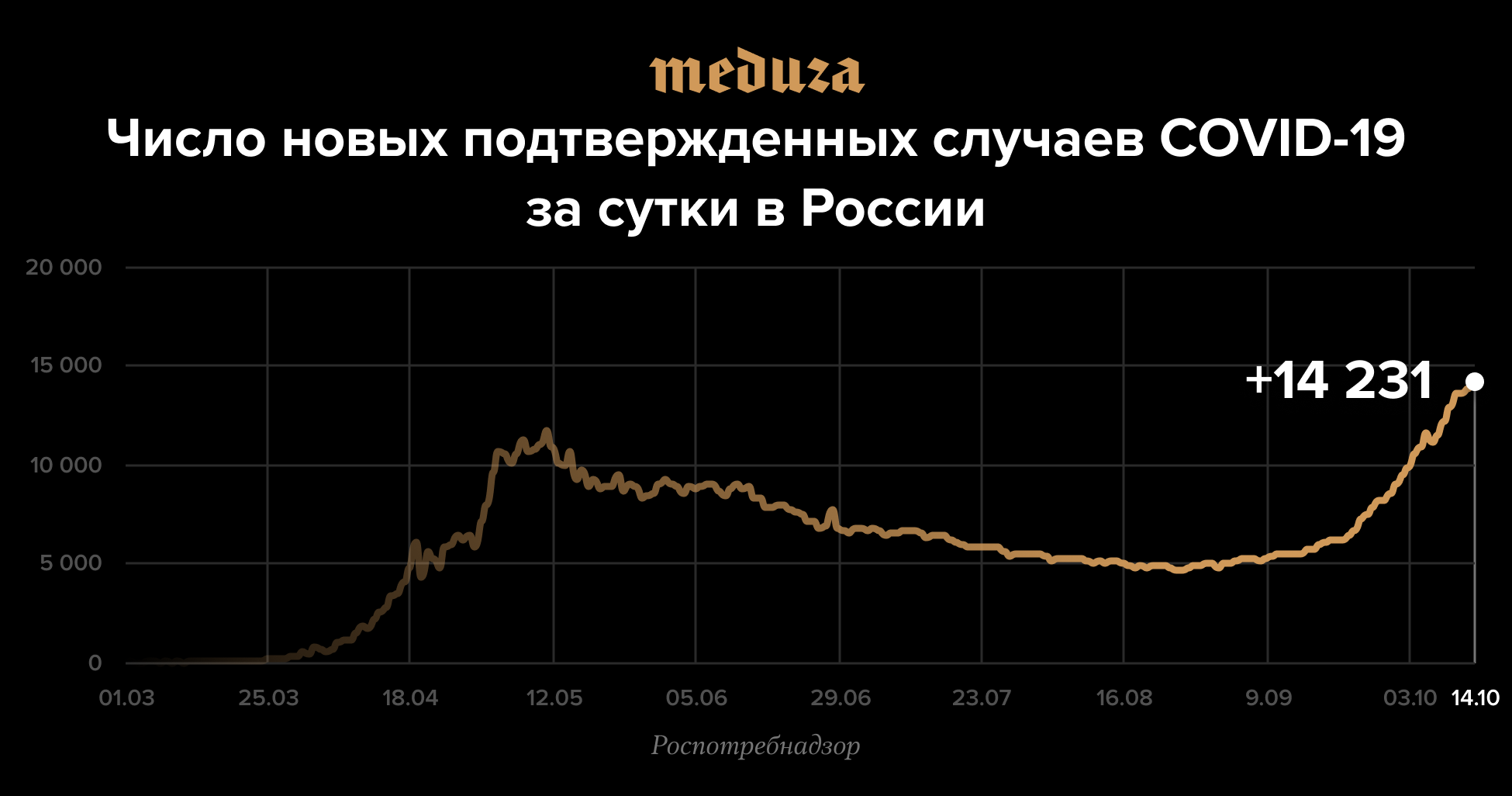 Впервые с начала пандемии в России за сутки выявили более 14 тысяч случаев COVID-19: заболели 14 231 человек. За все время в стране заразились 1 340 409 человек. За сутки из больниц выписали 7920 пациентов с ковидом. Всего выздоровели 1 039 705 человек. За сутки умерли 244 человека, всего — 23 205 человек.