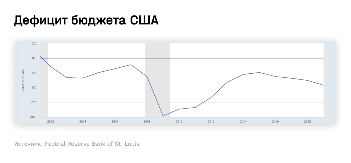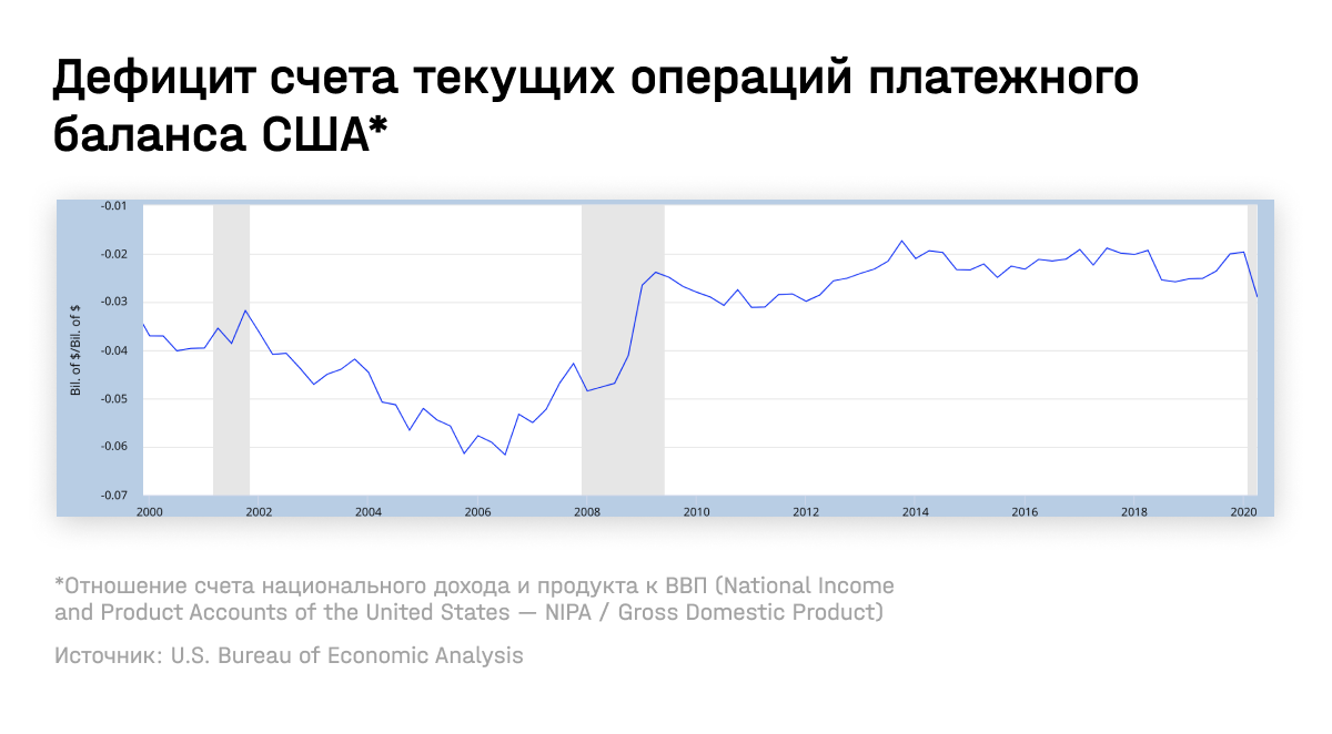 До кризиса 2008–2009 годов дефицит достиг самого большого значения: 6% ВВП. В первую очередь это было вызвано тем, что американцы мало сберегали — ставки были низкие, поэтому они охотно брали кредиты. В то же время Китай, Япония и нефтедобывающие страны активно экспортировали в Америку капитал. В результате рецессии американские потребители и бизнесы принялись гасить кредиты, стали больше сберегать. Дефицит резко снизился: с 6 до 2% ВВП.