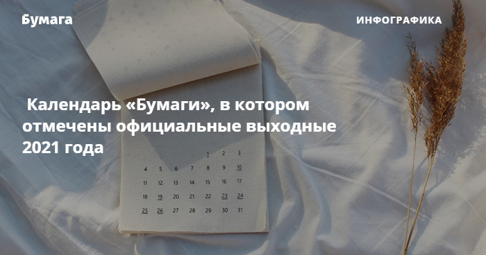 Правительство России определило дни, которые станут выходными в следующем году. Запланировано семь праздничных периодов: с 1 по 10 января, с 21 по 23 февраля, с 6 по 8 марта, с 1 по 3 мая, с 8 по 10 мая, с 12 по 14 июня и с 4 по 7 ноября. 23 апреля Владимир Путин также объявил нерабочими дни между майскими праздниками — с 4 по 7 мая. «Бумага» подготовила календарь, в котором отмечены официальные выходные 2021 года.